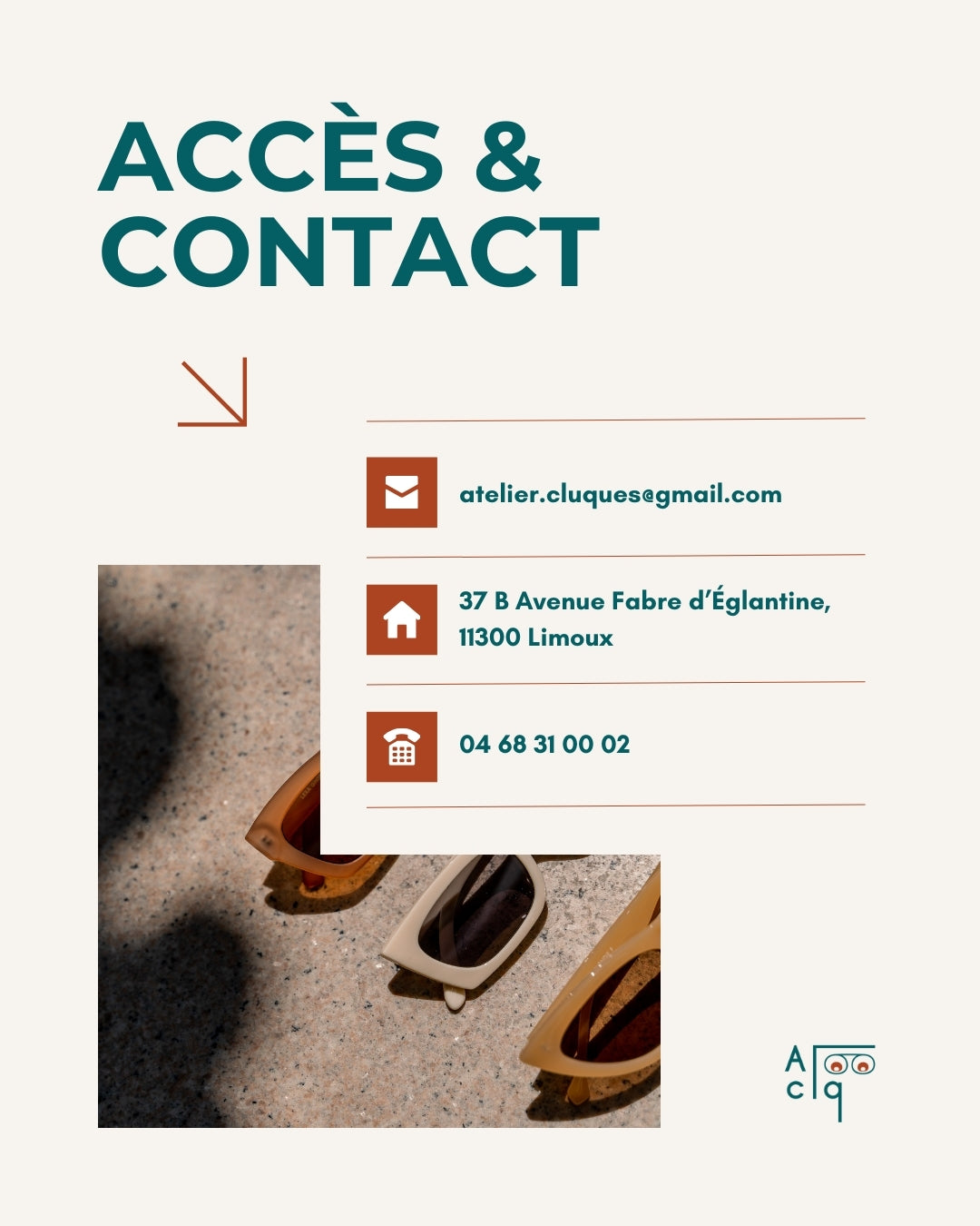 Passioné par l’optique et l’accompagnement de mes patients vers une solution adaptée à leurs besoins visuels, je suis heureux de créer Atelier Cluques, un magasin dans lequel vous retrouverez un large choix de lunettes de vue, de soleil et autres accessoires.